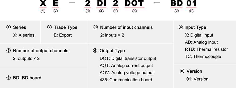 | 7 | XE-2AI1AO-BD01 | 2AI, ประเภทแรงดันไฟฟ้า 12 บิต; 1AO, เอาต์พุตแรงดันไฟฟ้า 12 บิต/เอาต์พุตกระแส 11 บิต | อินพุตแบบอะนาล็อก ×2, เอาต์พุตแบบอะนาล็อก ×1 |