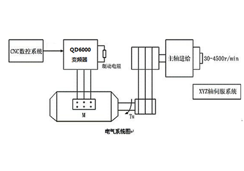 | 04 System Introduction: In this system, the 4KW CNC machine tool spindle is driven by the RVE32 5.5KW inverter, and the fast braking and stopping are realized through the external braking unit and braking resistor. The speed variation caused by the load change is very small by the open-loop vector control. | | ||||||||||||||||||